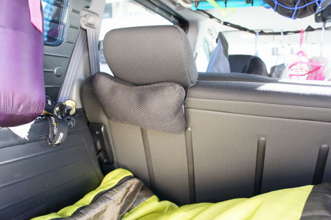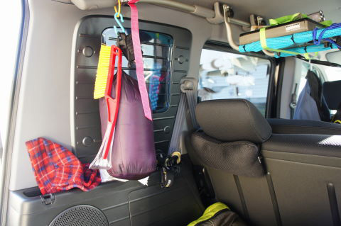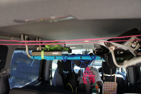 リア席のグラブバーをタイダウンベルトで繋いで、