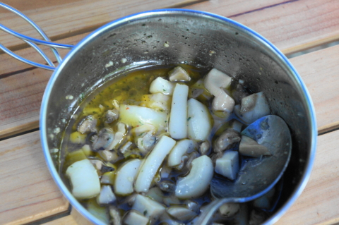 シーフードミックスとアヒージョの素で、簡単アヒージョの出来上がり。